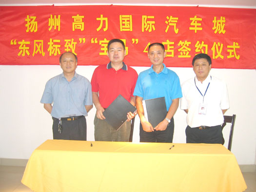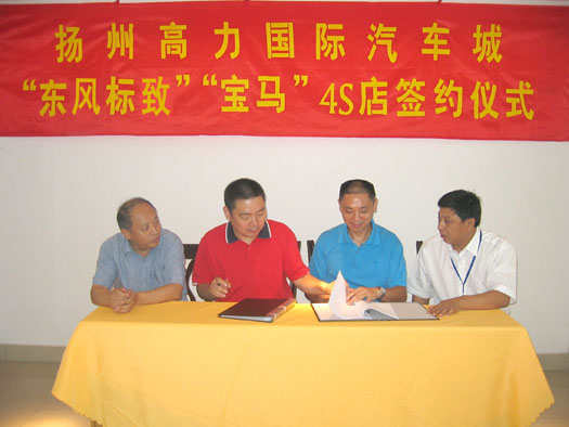 2007年7月18日,揚州高力國際汽車城與揚州金鑫房地產(chǎn)公司在揚州分公司四樓會議室舉行了“東風(fēng)標(biāo)致”、“寶馬”4S店簽約儀式,總經(jīng)理陳利平、集團(tuán)商管中心孫志明副總參加了此次簽約儀式。